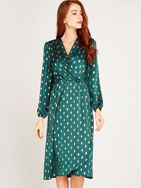 – dekolt: V- krój rękawów: bufiasty- zakończenie rękawów: elastyczne- talia: elastyczna- krój: litera A- nadruk: metaliczny- wzór: na całości