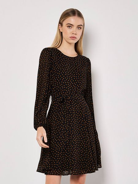 – dekolt: okrągły- zapięcie: suwak na plecach- krój rękawów: bufiasty- zakończenie rękawów: elastyczne- zdejmowany pasek: tkanina- krój: litera A- wzór: kropki