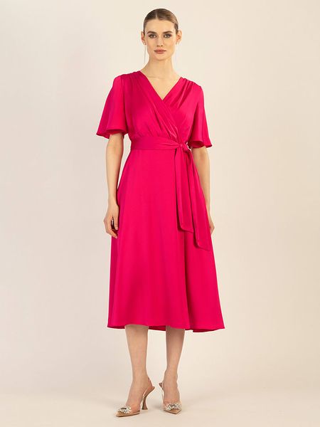 – dekolt: V- zapięcie: suwak na plecach- krój rękawów: motylek- zdejmowany pasek: tkanina- kieszenie: wpuszczane- krój: litera A- look: jednokolorowy, imitacja satyny