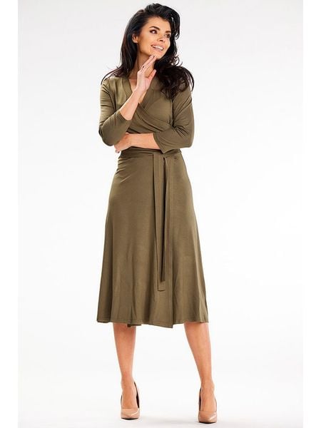– dekolt: V- długość rękawa: 3/4- w talii wiązanie: tak – krój: rozkloszowany- look: jednokolorowy