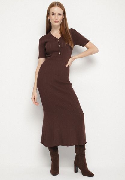Brązowa Dzianinowa Sukienka z Wiskozą o Taliowanym Kroju z Guzikami Fenallea