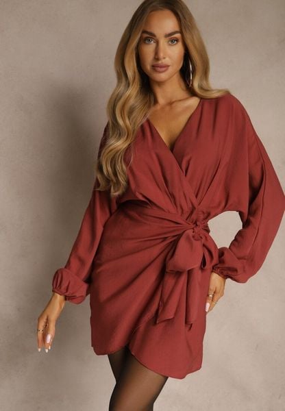 Czerwona Kopertowa Sukienka z Wiskozy z Bufiastymi Rękawami Wiązana w Talii Anevra