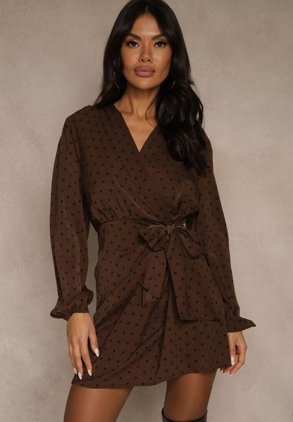 Brązowa Sukienka w Groszki o Kopertowym Kroju z Wiązaniem w Talii Enevia