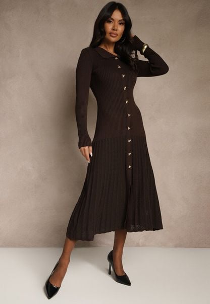 Brązowa Sweterkowa Sukienka z Wiskozy Ozdobiona Guzikami Zozeria