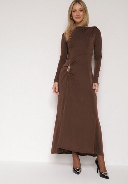 Brązowa Koktajlowa Sukienka Ozdobiona Metaliczną Aplikacją i Marszczeniem z Boku Retima