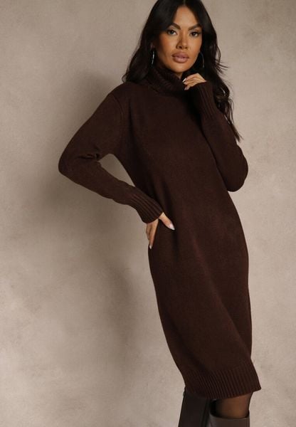 Brązowa Sweterkowa Sukienka z Bawełną i Golfem Reinaria
