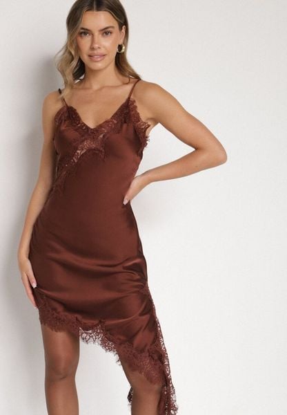 Brązowa Asymetryczna Sukienka z Satyny Ozdobiona Koronką Monivea
