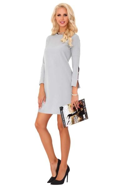 Szara Prosta Sukienka z Ozdobnym Rękawem