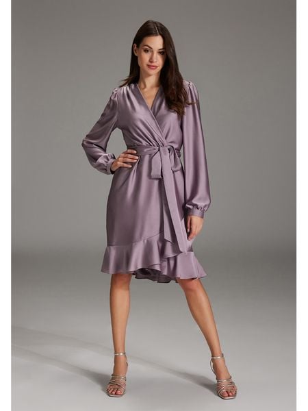 – dekolt: V- zapięcie: suwak na plecach- talia: elastyczna- zdejmowany pasek: tkanina- zakończenie rękawów: mankiet na guzik- dolny brzeg: asymetryczny, falbany- krój: taliowany- look: jednokolorowy