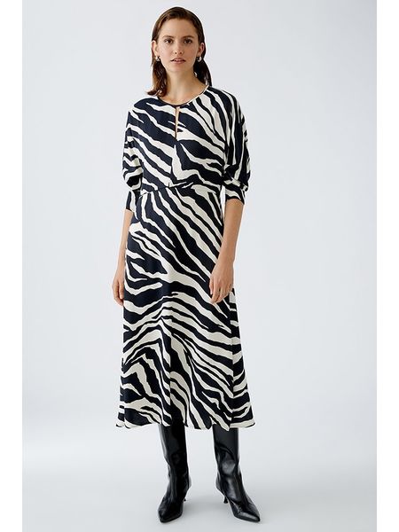 – czysta wiskoza- dekolt: okrągły- detale: wycięcia- krój: taliowany- wzór: zebra