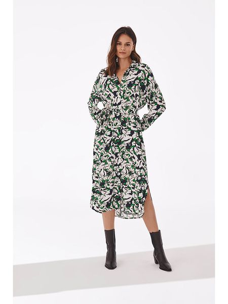 – czysta wiskoza- kołnierz: kent- zapięcie: listwa guzikowa- w talii wiązanie: tak – dolny brzeg: zaokrąglony – krój: luźny- wzór: na całości