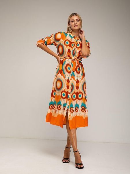 – czysta wiskoza- dekolt: okrągły- zapięcie: listwa guzikowa- zdejmowany pasek: tkanina- zakończenie rękawów: patka i guzik- krój: prosty- wzór: na całości