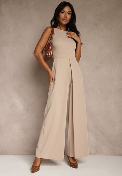 Beżowy Taliowany Kombinezon Ozdobiony Zakładkami Berinola
