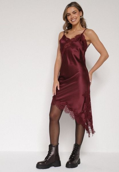 Bordowa Asymetryczna Sukienka z Satyny Ozdobiona Koronką Monivea