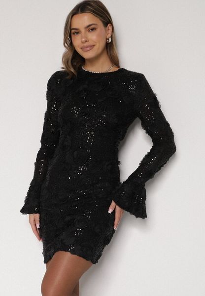 Czarna Cekinowa Sukienka z Kwiatami 3D Naweda