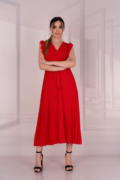 Elegancka Plisowana Sukienka z Kopertowym Dekoltem – Czerwona