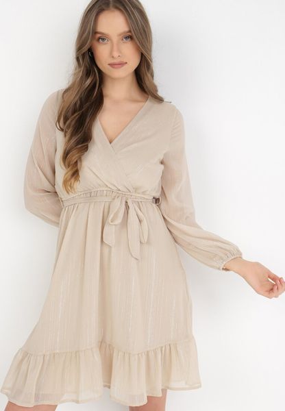 Sukienka Pronestra wykonana z gładkiej, delikatnej tkaniny, w całości pokrytej metaliczną nitką. Model o długości mini. Zakończona delikatną falbanką. W pasie ściągana gumką oraz dodatkowo wyposażona w materiałowy pasek. Z głębokim, kopertowym dekoltem. Zmysłowa i kobieca sukienka Pronestra wygląda fantastycznie zestawiona z wiązanymi sandałkami na słupku lub eleganckimi balerinkami.