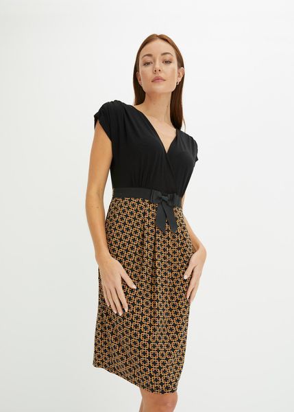 Sukienka shirtowa z podwyższoną talią z doszytym paskiem z kokardką. Dekolt z imitacją założenia kopertowego. Dekoracyjne marszczenie na rękawach. Poniżej biustu kontrastowy pasek z kokardką i zakładki. Dł. ok. 90 cm w rozm. 36/38. Można prać w pralce.