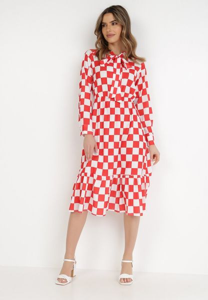 Sukienka Phaenano o długości midi. Fason z gumką w talii i rozkloszowanym dołem. Trójkątny dekolt z wiązaniem przy szyi. Długi rękaw wykończony mankietem. Na dole doszyta falbanka. Bez podszewki. Zapinana na guziki do linii talii. Pokryta wzorem w szachownice w modnych kolorach. Gumka po rozciągnięciu mierzy: S/M = 97 cm, L/XL = 103 cm. Oryginalna […]