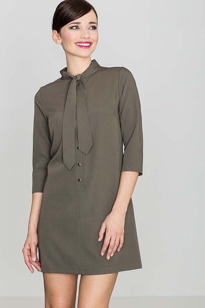 Uniwersalna Oliwkowa Koszulowa Sukienka z Wiązaną pod Szyją Szarfą