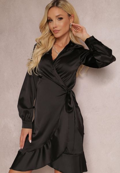 Sukienka Deinarpia wiązana w pasie, z głębokim, trójkątnym dekoltem. O kopertowym fasonie. Mini, zakończona subtelną falbanką. Wykonana z satynowej tkaniny. Bez podszewki. Dopasuj do niej delikatną biżuterie, kozaki za kolano lub klasyczne szpilki. Zakochasz się w jej pięknym wykonaniu i ponadczasowym stylu!