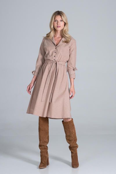 Rozkloszowana Sukienka na Guziki z Żakietowym Kołnierzykiem – Beżowa
