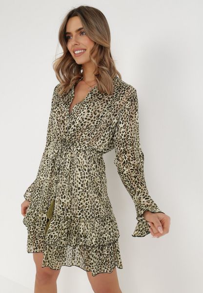 Sukienka Chrysastis ozdobiona supermodnym printem zwierzęcym, o długości mini. Zakończona falbankami, które dodają całości lekkości. O taliowanym fasonie, w pasie ściągana troczkiem. Z trójkątnym dekoltem, zapinanym na guziczki. Zdobiona metaliczną nicią. Z elastyczną podszewką. Znakomicie ożywi Twoją stylizację, jednocześnie dodając jej zwiewności. Must-have wielbicielek motywu zwierzęcego!