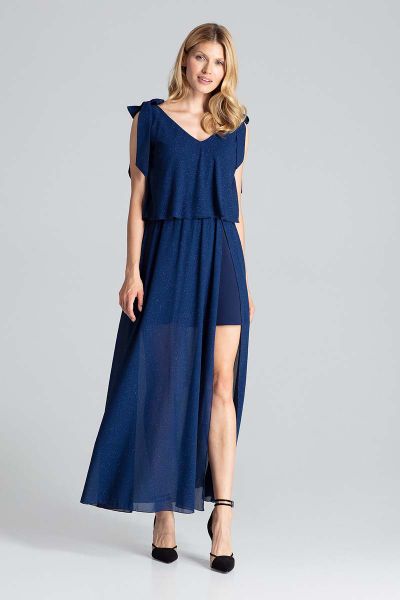 Granatowa Warstwowa Maxi Sukienka Wiązana na Ramionach