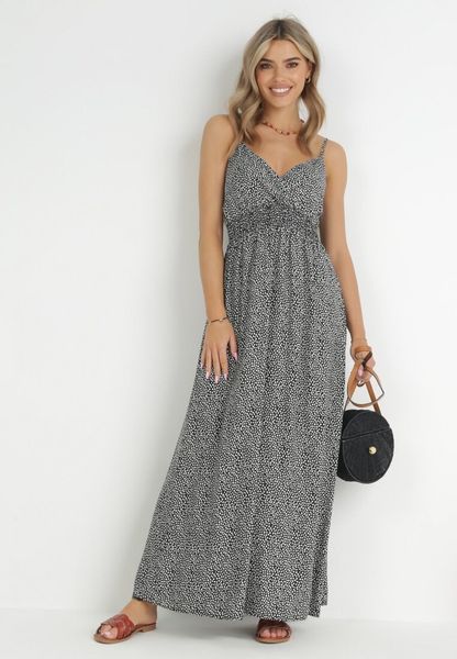 Sukienka Doriaroe o rozkloszowanym kroju i długości maxi, z delikatnymi ściągaczami eksponującymi wcięcie w talii. Z głębokim, kopertowym dekoltem. Długość cienkich ramiączkach można regulować. Całość pokryto delikatnym, drobnym wzorem. Bez podszewki. Szerokość w pasie po rozciągnięciu: S/M = 89 cm, L/XL = 91 cm. Szukasz kobiecej sukienki na lato? Ta będzie doskonałym wyborem!