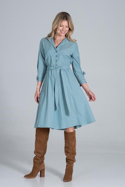 Rozkloszowana Sukienka na Guziki z Żakietowym Kołnierzykiem – Zielona
