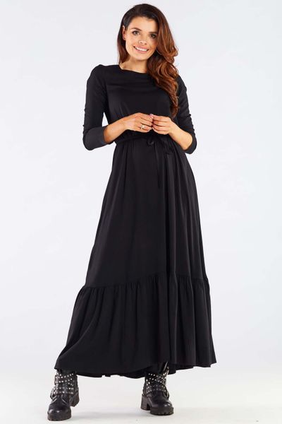 Maxi Sukienka z Długim Rękawem z Falbanką na Dole – Czarna