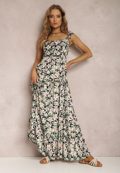 Sukienka Agarynome na ramiączkach ze sprężystą gumką. Model o długości maxi. Z falbanami na dole i ramiączkach. Kwadratowy dekolt. Rozkloszowany fason. Ozdobiona guzikami z przodu do linii talii. Z tyłu elastyczne, marszczone gumki. Bez podszewki. Zdobiona wzorem w duże kwiaty. Doskonała na upalne dni – lato to idealny czas na długie, kwiatowe sukienki!