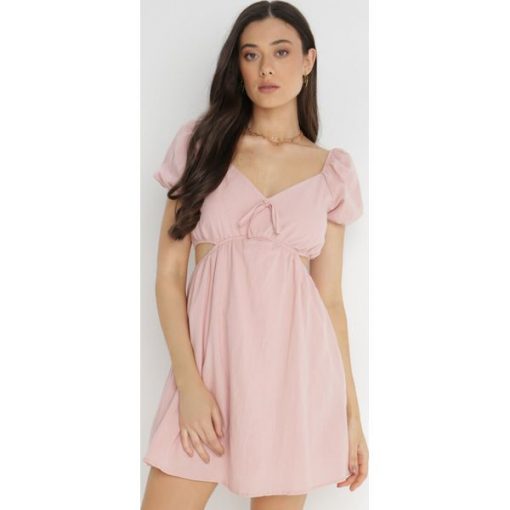Sukienka Roatta o długości mini. Modny fason z wycięciem po bokach. Trójkątny dekolt z wiązaniem z przodu, na plecach kwadratowy. Krótki, lekko bufiasty rękaw. Na dole rozkloszowana. Wykonana z bawełny, zachowana w jednolitej kolorystyce. Posiada nieelastyczną podszewkę. Letnia, bawełniana sukienka mini Roatta to fason, który wykorzystasz na wiele okazji.