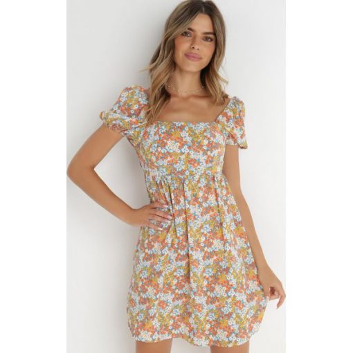Sukienka Konmey z krótkim, bufiastym rękawem. Kwadratowy dekolt. Z tyłu wiązana na cienki sznurek, odkryte plecy. Odcinana w talii, z cienką gumeczką. Udekorowana uroczym wzorem w kwiaty. Długość mini, bez podszewki. Letnia sukienka w stylu retro idealna do romantycznych stylizacji.