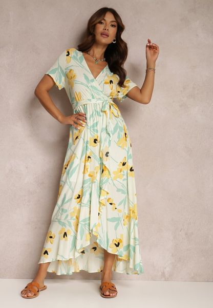 Sukienka Farida w stylu boho. Model kopertowy, z głębokim dekoltem i krótkim rękawkiem oraz elastyczną podszewką. Asymetryczny, rozkloszowany dół zdobi falbana. W talii wszyta elastyczna gumka, dodatkowo sukienka ma także wiązanie materiałowym paskiem. To casualowa, codzienna propozycja, która sprawdzi się w połączeniu z sandałami i torbą plażową lub shopperką.