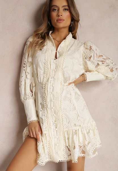 Sukienka Hermamna o długości mini. Taliowana, w tylu retro z koronkowej tkaniny. Dekolt ze stójką, dół rękawów i sukienki obszyte ażurową lamówką. Zapinana na powlekane tkaniną guziki. Długi rękaw z mankietem na trzy guziki. Na dole doszyta falbana. Posiada podszewkę. Elegancka sukienka koronkowa vintage to prawdziwa perełka, którą warto mieć w swojej szafie!