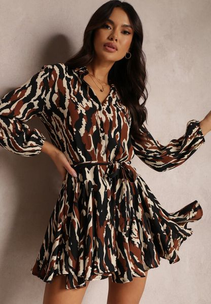 Brązowa Sukienka Koszulowa z Materiałowym Paskiem Mariou