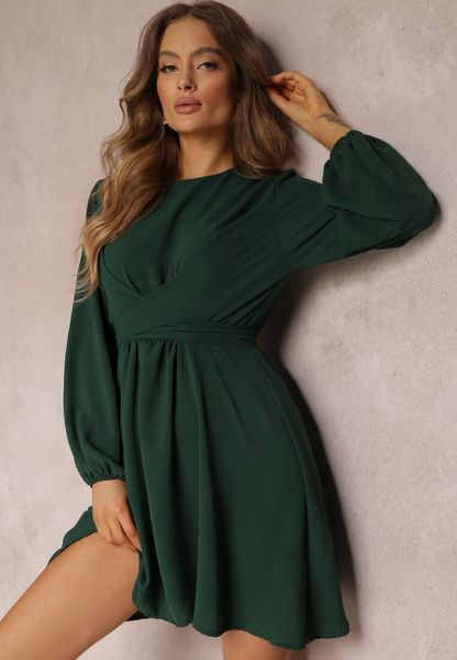 Ciemnozielona Sukienka Rozkloszowana z Gumką w Pasie Thelo