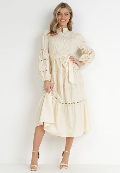Sukienka Palovi o rozkloszowanym fasonie i wielkości midi, bez podszewki. Zapinana na guziki do linii talii, w pasie wiązana paskiem. Ażurowe wstawki na całej długości sukienki i rękawach. Przy dekolcie delikatna stójka. Ażurowa sukienka Palovi idealna na wiosnę i lato.
