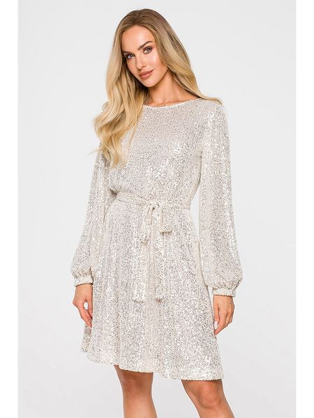 – dekolt: okrągły- rękaw: bufiasty – w talii wiązanie: tak – ściągacz: zakończenia rękawów- detale: cekiny- krój: litera A- look: jednokolorowy