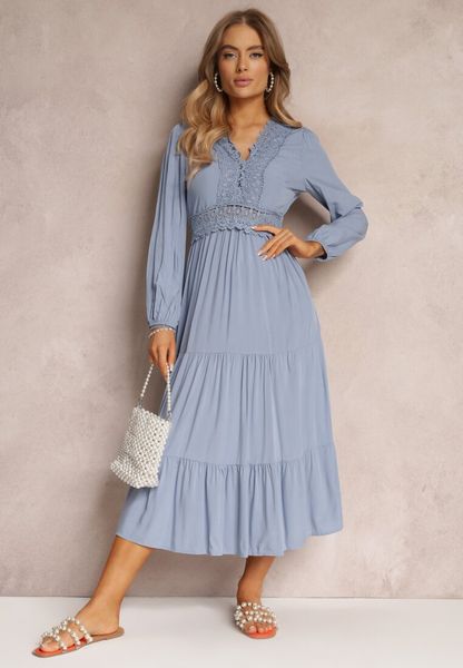 Niebieska Sukienka Rozkloszowana z Falbanką i Koronką Kiaya