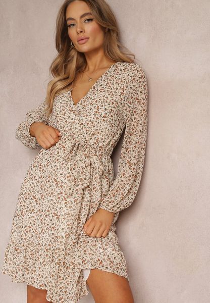 Beżowa Sukienka z Kopertowym Dekoltem i Gumką w Talii Adedora