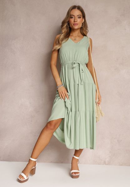 Miętowa Wiązana Sukienka Midi z Wiskozy bez Rękawów z Gumką w Talii Mideyo