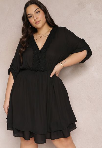 Czarna Sukienka Mini z Gumką w Talii i Koronkowymi Wstawkami Kelia