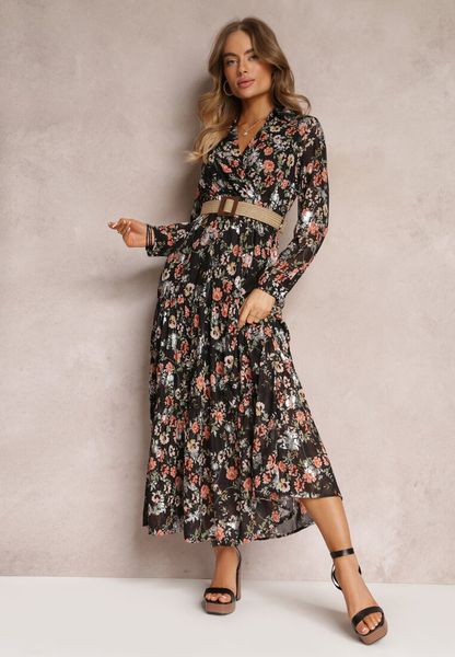 Sukienka Elanisa o długości maxi z falbaną na dole i plecionym paskiem w komplecie. Góra z kopertowym dekoltem, kołnierzykiem mi długim rękawem. Z podszewką. Udekorowana błyszczącym wzorem w kwiaty. Gumka w pasie po rozciągnięciu mierzy: S = 95 cm, M = 99 cm, L = 103 cm, XL = 107 cm.
