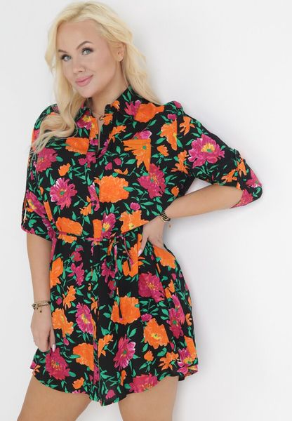Czarno-Pomarańczowa Koszulowa Sukienka Mini z Guzikami i Materiałowym Paskiem Raimeda