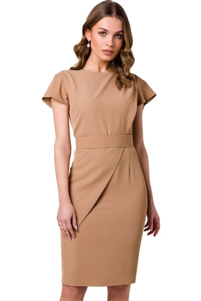 Elegancka ołówkowa sukienka z paskiem krótki rękaw beżowa