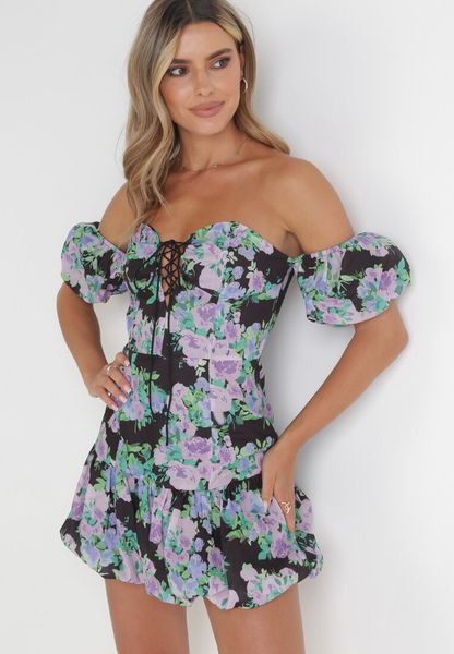 Czarno-Fioletowa Sukienka Mini z Opuszczonymi Rękawami i Ozdobnym Sznurowaniem z Bawełny Gabrisa