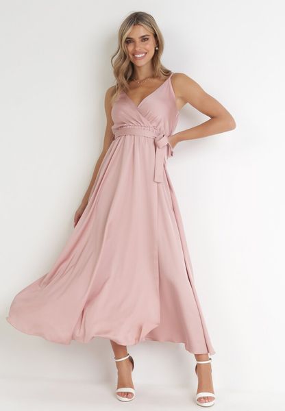Jasnoróżowa Sukienka Maxi z Gumką w Pasie i Kopertowym Dekoltem Aloyse
