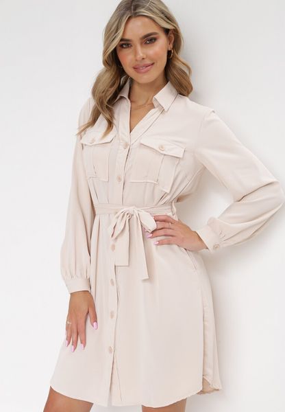 Sukienka Aravia o koszulowym fasonie mini. Zapinana na guziki. Z tyłu ozdobnie plisowana. Na górze kieszenie z klapą. Wiązana paskiem z tego samego materiału. Wsuwane kieszenie na wysokości bioder. Tył sukienki dłuższy. Długie rękawy z mankietami na guzik.